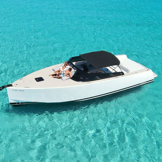 The VanDutch 40 is instantly recognizable for its clean lines, low profile, & ultra modern design. Built for stylish day cruising in Ibiza, the yacht features a spacious aft sunbed, a generous central lounge area with a large dining table, & a comfortable forward seating zone. The open deck layout encourages effortless movement & social interaction, making it perfect for relaxed afternoons at anchor or cruising between Ibiza & Formentera. Premium materials, elegant upholstery, & refined detailing create a sophisticated yet laid back onboard atmosphere.